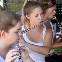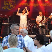 Mit „Ohne Yoko“, die zweite Band des Abends um die beiden Powerfrauen Nicole Friese und Patrizia Camassa, wurde es dann ab 22.00 Uhr rockig. „Ohne Yoko“ ist eine erstklassige Cover-Band und sieht sich selbst als gelungenen Spagat zwischen den Songs der Vergangenheit und den Charts der Gegenwart. Die vier Jungs und zwei Mädels der Coverband schafften es mühelos, verbindende Elemente der, auf dem zweiten Blick, gar nicht so unterschiedlichen Musikrichtungen der vergangenen 30 Jahre im „Ohne Yoko “ Programm einzubauen. Sie boten außergewöhnliche Interpretationen bekannter Songs ohne jeden pathetischen Pomp, dafür mit viel Power und dem richtigen Beat im Blut. Sich selbst dabei nicht so ernst zu nehmen und trotzdem musikalisch hervorragend zu sein – „Ohne Yoko“ schaffte das mühelos. Aushängeschilder der Band sind eindeutig die zwei stimmgewaltigen Sängerinnen, die vom ersten Moment an dafür sorgten, dass schnell eine gute Stimmung aufkam. Neben Klassikern von „Deep Purple“, „AC/DC“, „Toto“, und „Abba“ servierten die sechs Damen und Herren vor allem die Hits der letzten Jahre, wie etwa von „Pink“ und „Mando Diao“, „Gossip“ oder „Sunrise Avenue“. „Ohne Yoko“ spielten bereits auf unzähligen Gigs in ganz Deutschland, in Kneipen, auf Abibällen, großen und kleinen Bühnen, Feiern und Festen, und, und, und…! Die Band bestand aus Marc Friese (Bass & Backings), Heiko Lautwein (Gitarre), Axel Eberl (Gitarre) und Stefan Klobes (Schlagzeug & Gesang), sowie den beiden Sängerinnen Patrizia Camassa und Nicole Friese.