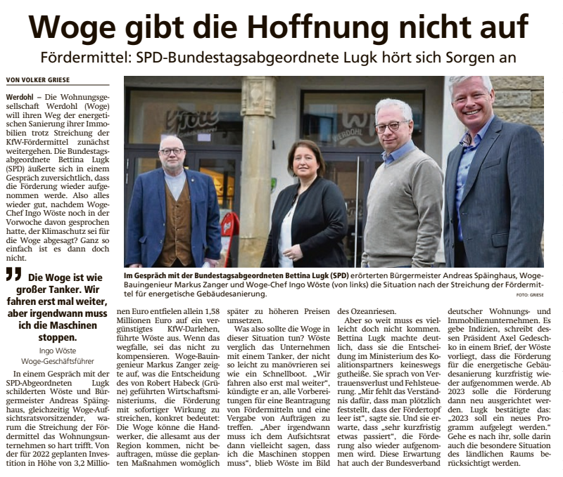 Die SPD-Bundestagsabgeordnete Bettina Lugk erhörte den Ruf von Herrn Wöste und kam am 09.02.2022 mit dem Werdohler Bürgermeister Andreas Späinghaus zur Woge-Werdohl, um sich die Sorgen anzuhören.