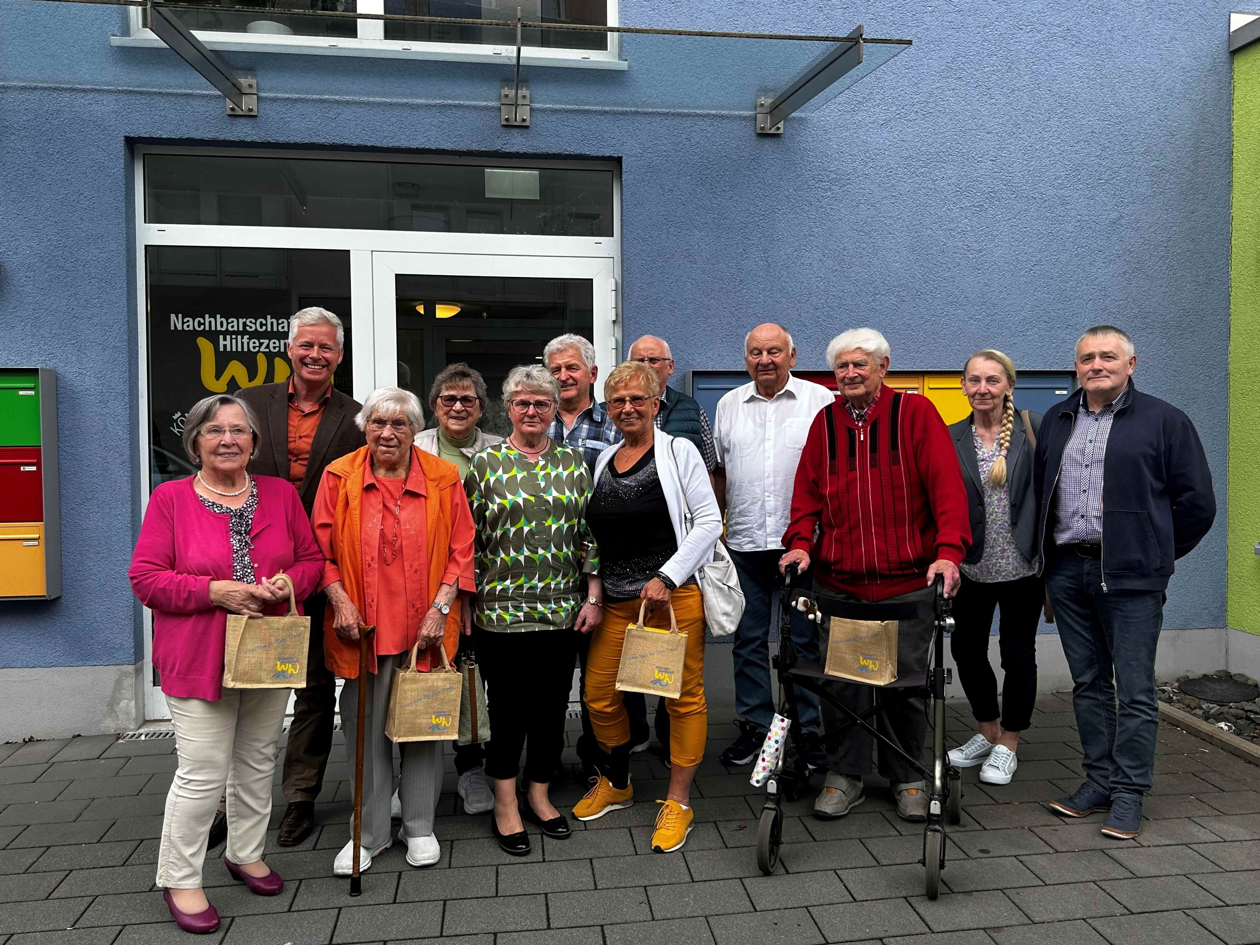 Woge-Chef Ingo Wöste (zweiter v.l.) im Kreise der geehrten Mietparteien vor dem Nachbarschaftshilfezentrum Werdohl-Königsburg