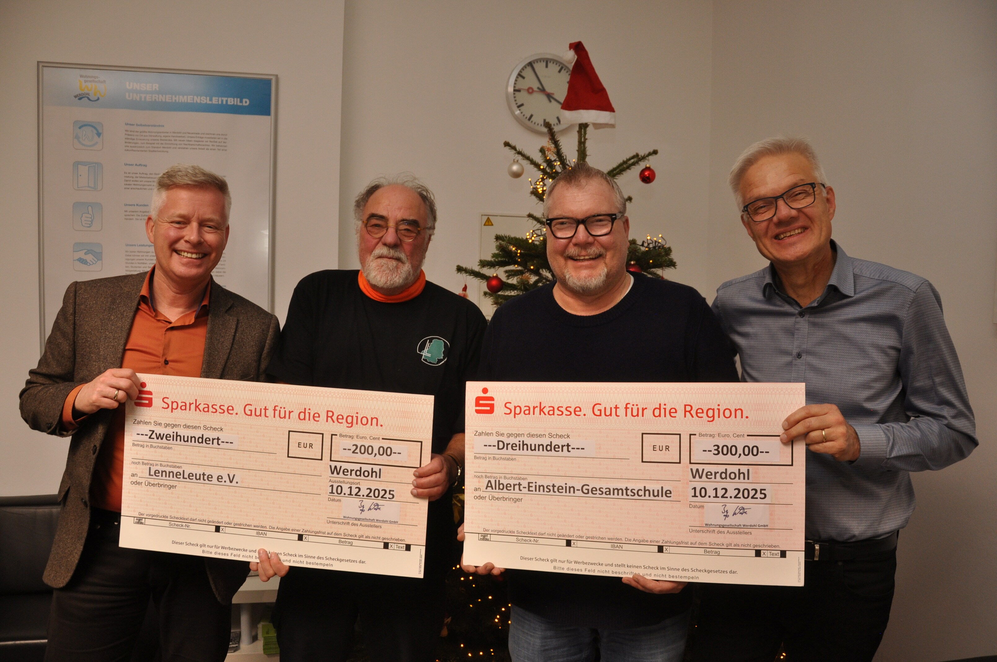 Die Woge-Werdohl hat in diesem Jahr wieder auf die postalischen Weihnachtsgrüße verzichtet. Stattdessen wird das Geld als „Weihnachtsspende“ gemeinnützigen Zwecken zugutekommen. Mit 200 € werden die Lenne-Leute e.V., die unter anderem das sehr beliebte Brückenbürgerweinfest ausrichten und mit 300 € der Förderverein der Albert-Einstein-Gesamtschule unterstützt
