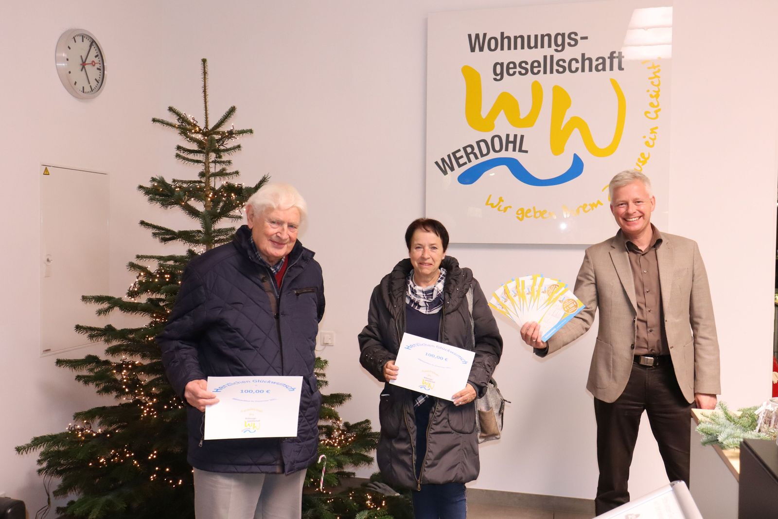 Die Woge-Werdohl hat im September 2021 eine Mieterbefragung in ihrem Gesamtbestand durchgeführt. Unter allen teilnehmenden Mietparteien wurden zum Dank 4 x 100 € einmaliger Mietnachlass verlost. Gewonnen haben Frau Marion Görg aus Werdohl-Ütterlingsen, Frau Gertrud Balzer aus Werdohl-Pungelscheid und Frau Gerda Vollmert aus Neuenrade. Auch Herrn Ernst Krause aus Werdohl-Pungelscheid war das Glück hold.