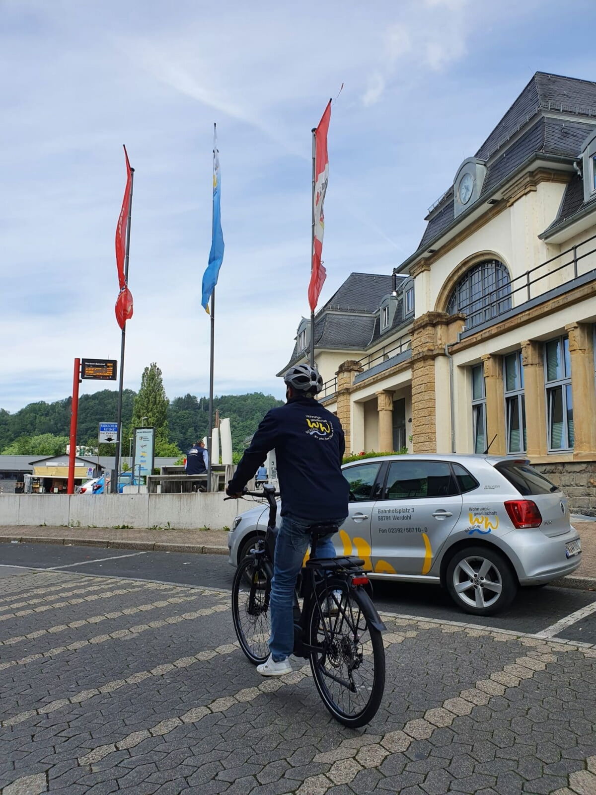 Am letzten Freitag unternahm unserer Wohnungsvermieter Herr Peter Töws seine erste Fahrt mit dem E-Bike zu einem Vermietungsgespräch. Mit der Woge-Jacke gekleidet und vorbildlich mit Helm unterwegs sparte dieser einige Kilogramm CO2 ein und arbeitete dabei zusätzlich noch an seiner individuellen Fitness.