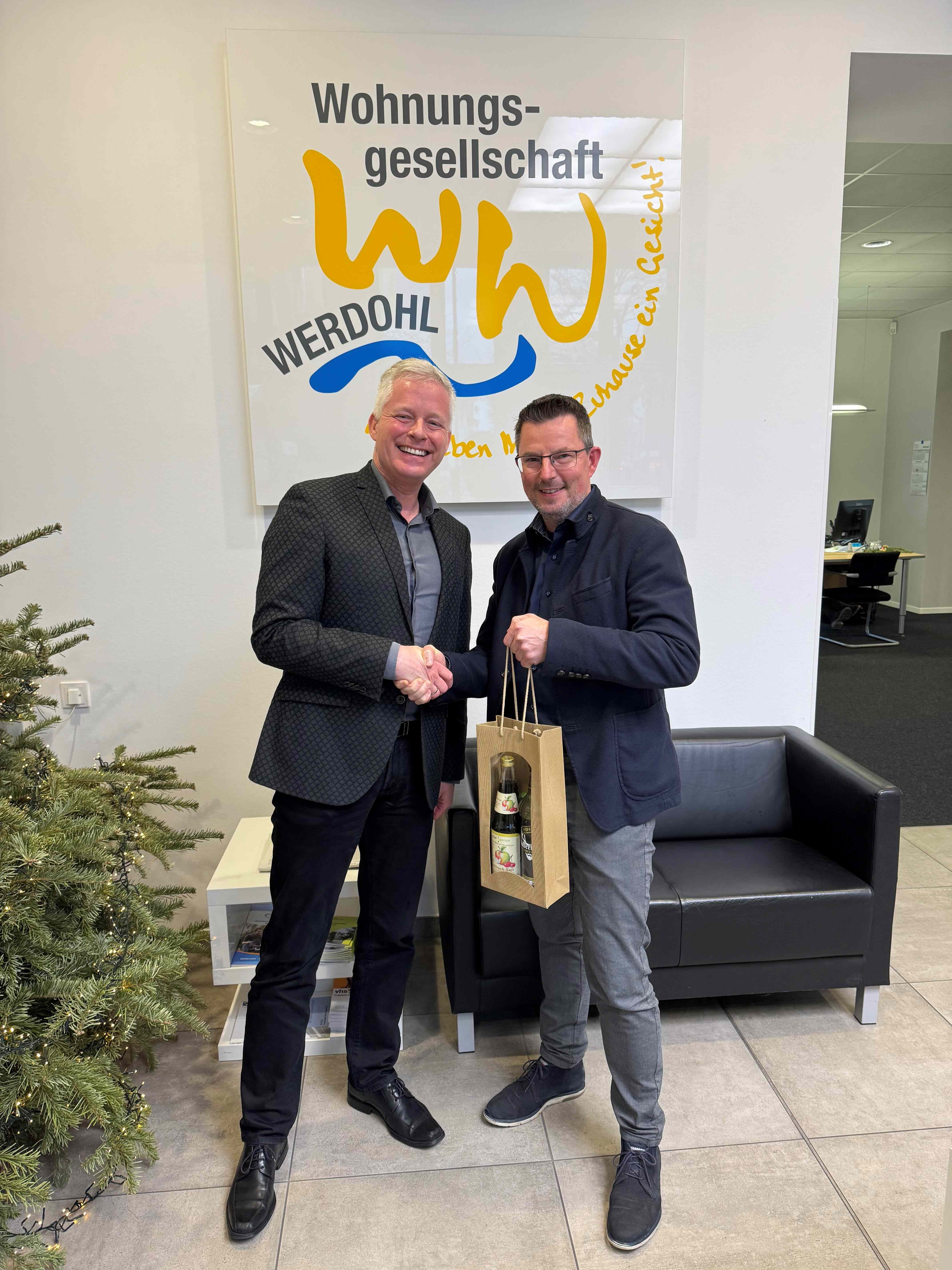 Im Jahr 1941 wurde die gemeinnützige Wohnungsgesellschaft mbH in Werdohl gegründet. Damit Wohnhäuser der Gesellschaft unter anderem gut gegen Sturm-, Wasser- und Feuerschäden versichert sind, kam es im Jahr 1944 zur Zusammenarbeit mit der westfälischen Provinzial Versicherung in Münster. In diesem Jahr jährt sich die Kooperation zum 80-sten Mal. Der Geschäftsstellenleiter Michael Henke vom Werdohler Provinzialbüro bedankte sich für das entgegengebrachte Vertrauen der letzten 80 Jahre und überbrachte ein kleines Geschenk.