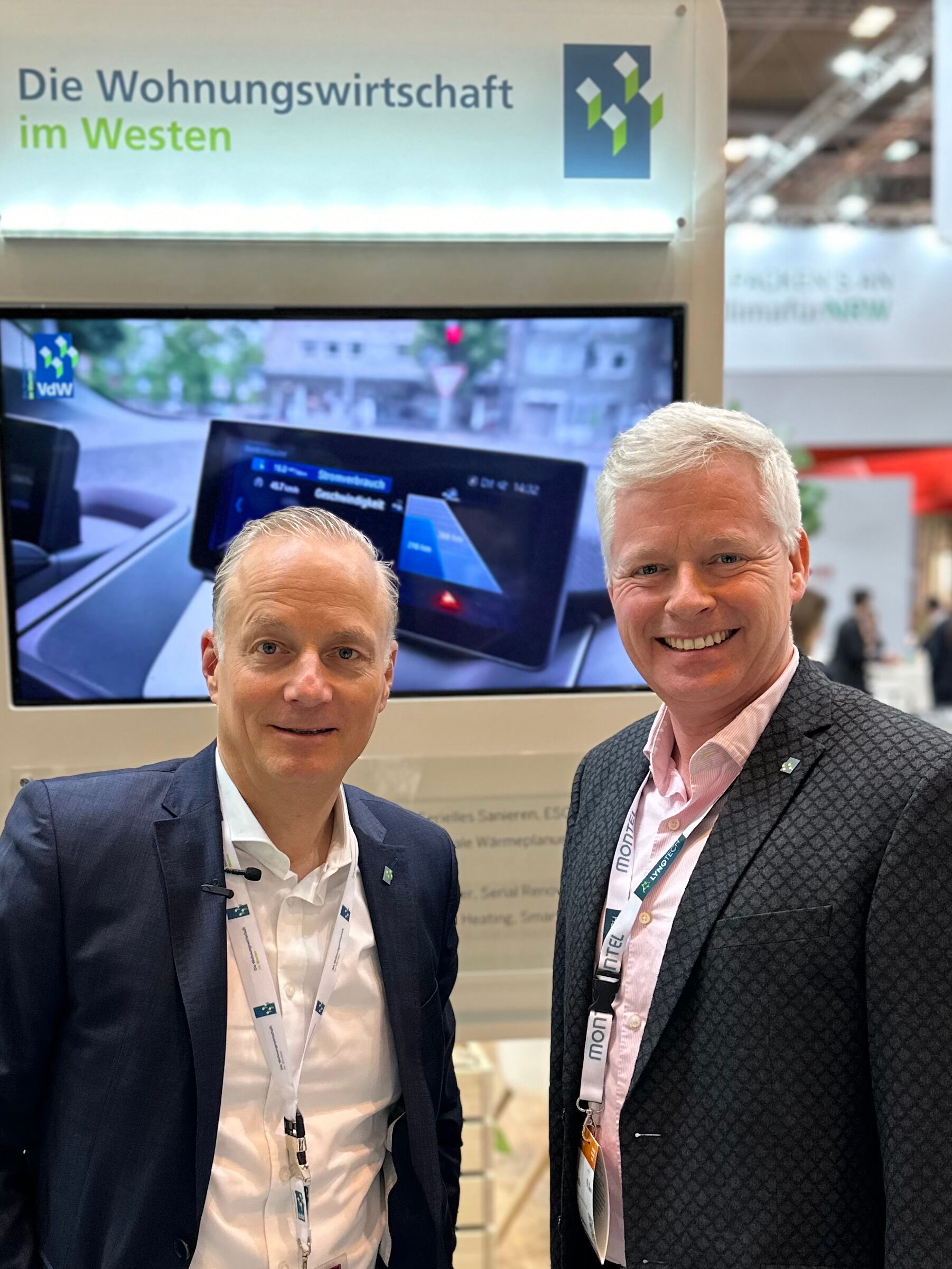 Bei der E-World kamen der Direktor des Verbandes der Wohnungs- und Immobilienwirtschaft Rheinland Westfalen, Alexander Rychter und Woge-Chef Ingo Wöste am 20.02.2024 zusammen, um zu besprechen, welche Rolle die Elektrifizierung zum Erreichen der Klimaziele spielt.