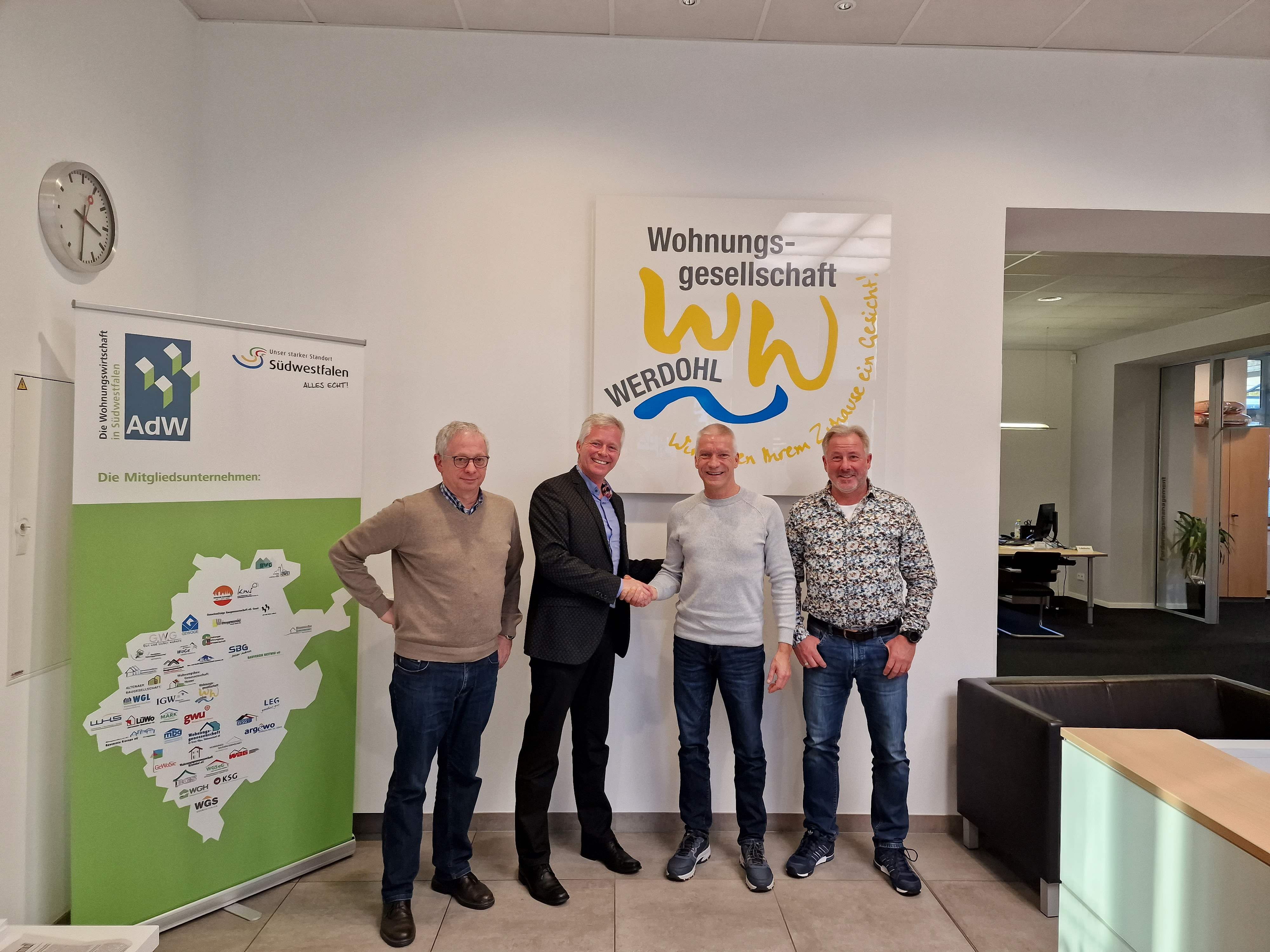 Woge-Chef Ingo Wöste vernetzt bei der E-World am 20.02.2024 die Woge-Werdohl (Gebäudeeigentümer) mit den Firmen Othermo (Heizungsmonitoring, Auslesung Gebäudemess- und Regeltechnik), PPC (Anbieter Smart-Meter-Gateway, CLS-Adapter) und Enervie (Energieversorger SWF, Strommessstellenbetreiber). Damit ist ein weiterer wichtiger Schritt für das Gelingen unseres Zieles der nahezuen Klimaneutralität bis 2035 eingeleitet worden.