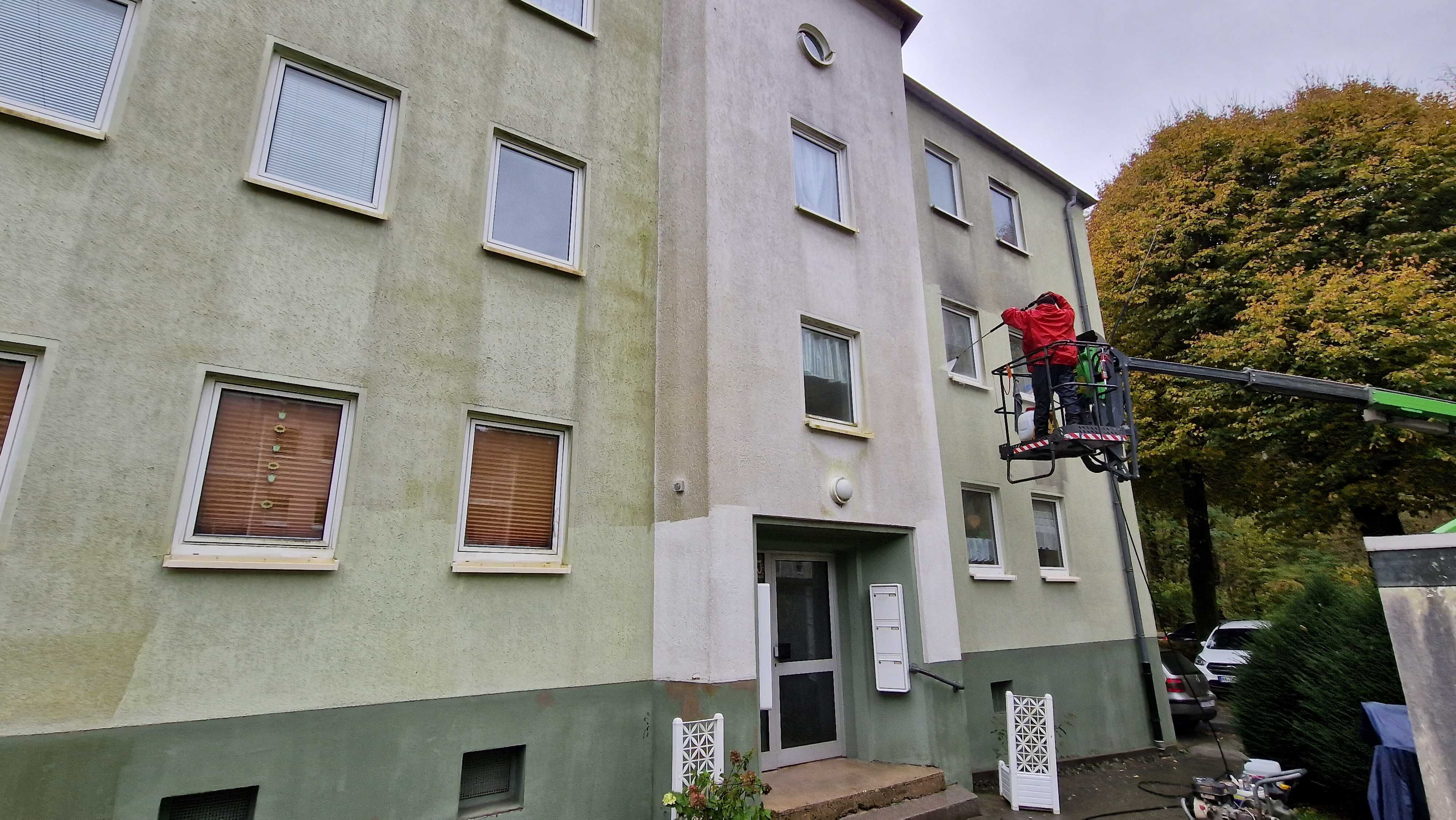 Nicht nur der Mai macht alles neu. In diesem Falle ist es sogar der Herbst. Im Stadtteil Werdohl-Ütterlingsen wurden die 10 Häuser Ütterlingser Straße 22,22a,24,24a,26,26a,28,28a und 30,30a komplett saniert. Unter anderem erhielten die Häuser eine ganz neue Wärmedämmung, die jetzt nach gut 20 Jahren auf der Schlagregenseite wieder gereinigt und aufgearbeitet wird.
